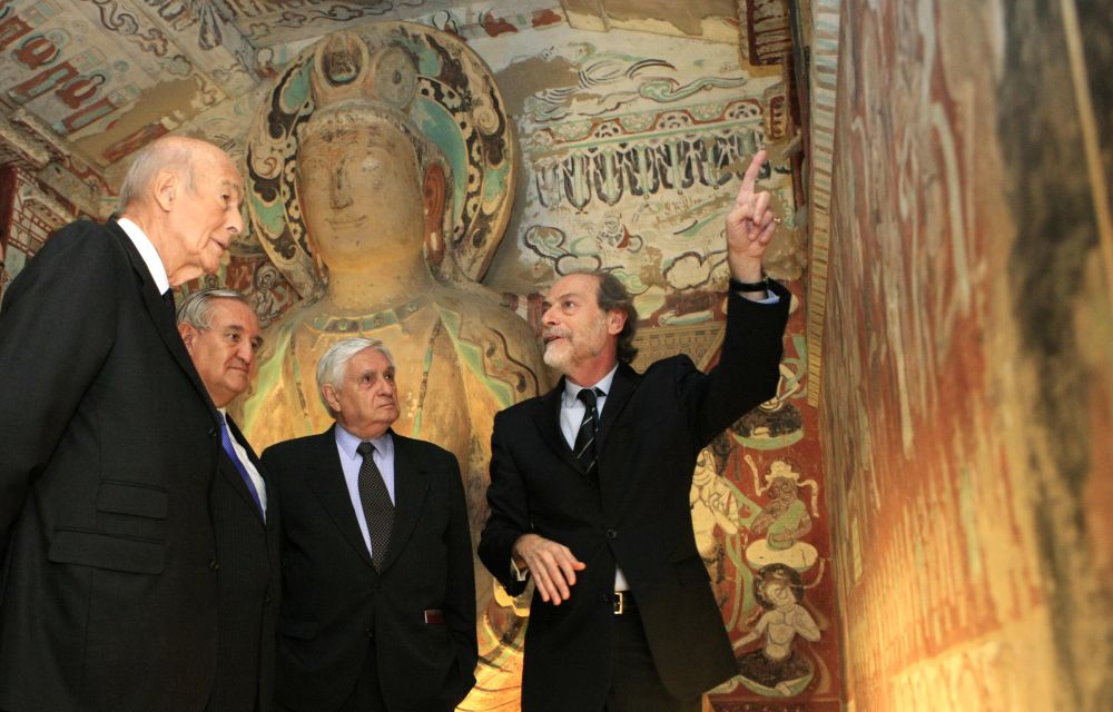 2008年11月20日,在法国巴黎,法国吉美博物馆馆长雅克·吉斯(右一)为法国前总统德斯坦(左一)和前总理拉法兰(左二)等介绍“敦煌花雨”艺术展上的敦煌复原洞窟。(张玉薇 摄)