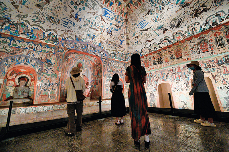 在敦煌石窟文物保护研究陈列中心,游客参观莫高窟复制洞窟第276窟壁画(2024年6月7日摄) 郎兵兵摄/本刊