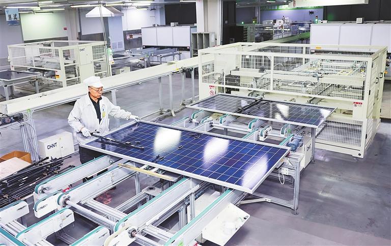 在酒泉市经开区的正泰光伏装备智能制造产业基地光伏组件生产线上,工人正在安装光伏板组件。新甘肃·甘肃日报记者 冯乐凯