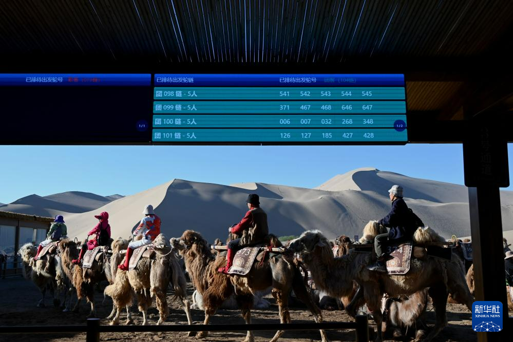 5月10日,在甘肃省敦煌市鸣沙山月牙泉景区骆驼乘骑区,游客有序乘骑骆驼。新华社发(张晓亮 摄)
