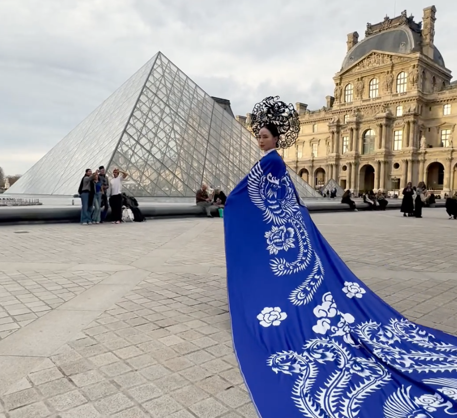 当千年剪纸化作飘逸衣衫,东方美学在法国巴黎街头具象化了。