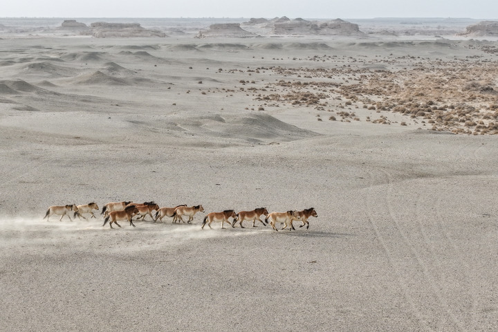 河西走廊西端,库姆塔格沙漠边缘,甘肃敦煌西湖国家级自然保护区(简称敦煌西湖保护区)66万多公顷的荒野中,200多匹野化放归的普氏野马自由驰骋。