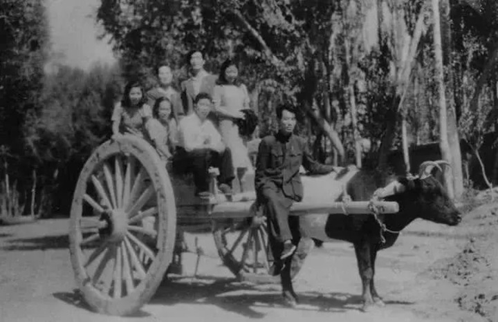 孙儒僴(前排右二)与同事们坐在牛车上(资料照片)。受访者供图